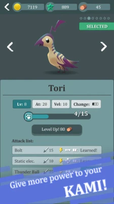 Choose your weapons and magic wisely to defeat enemies in as few turns as possible, earning rare materials and powerful emblems. Your Kami pets (creatures similar to pocket monsters) will support you in battle, unleashing devastating magic attacks when fully charged.