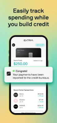 *Pricing and rewards availability will vary depending on plan and term selected. *Impact on your credit score may vary depending on your use. Extra is required to report both on time and late payments, which may negatively impact your credit score. *In order to transact with your Extra Debit Card, you must have an active, Plaid-compatible bank account linked to Extra's services. Extra sets each Cardholder's Spend Power based on a proprietary data-driven risk model, using objective signals to assist in the identification of those Cardholders who intend and are able to pay for their transactions.