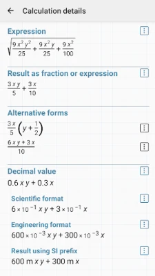 - calculation details - extended information about a calculation like all complex roots, unit circle etc.;