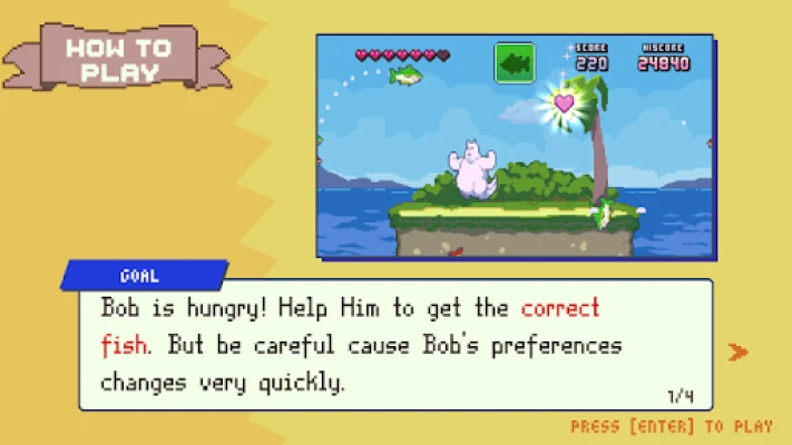 In Hungry Bob, you control a hungry — and slightly temperamental — cat in a never-ending fish frenzy. This is a fast-paced 2D arcade platformer where fish fall from the sky and your mission is simple (yet desperate): catch only the fish Bob wants at that moment. Grab the wrong one and you're in trouble.