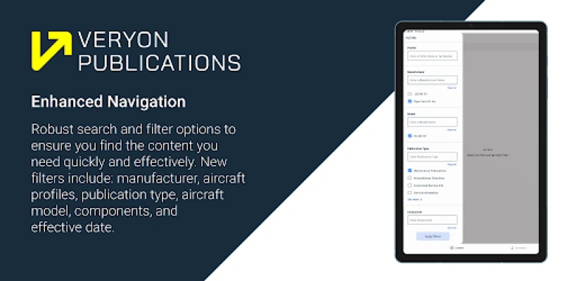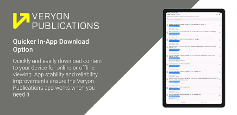 The Veryon Publications Mobile Application is included at no additional charge with a subscription to the Veryon Publications service. The Veryon Publications Mobile app allows Veryon customers to access critical maintenance and regulatory content,, anytime, anywhere. It enables both online and offline access so professionals can work however and whenever needed for increased productivity and operational efficiency. Customers use the app online or to download, store and access content from Veryon Libraries.